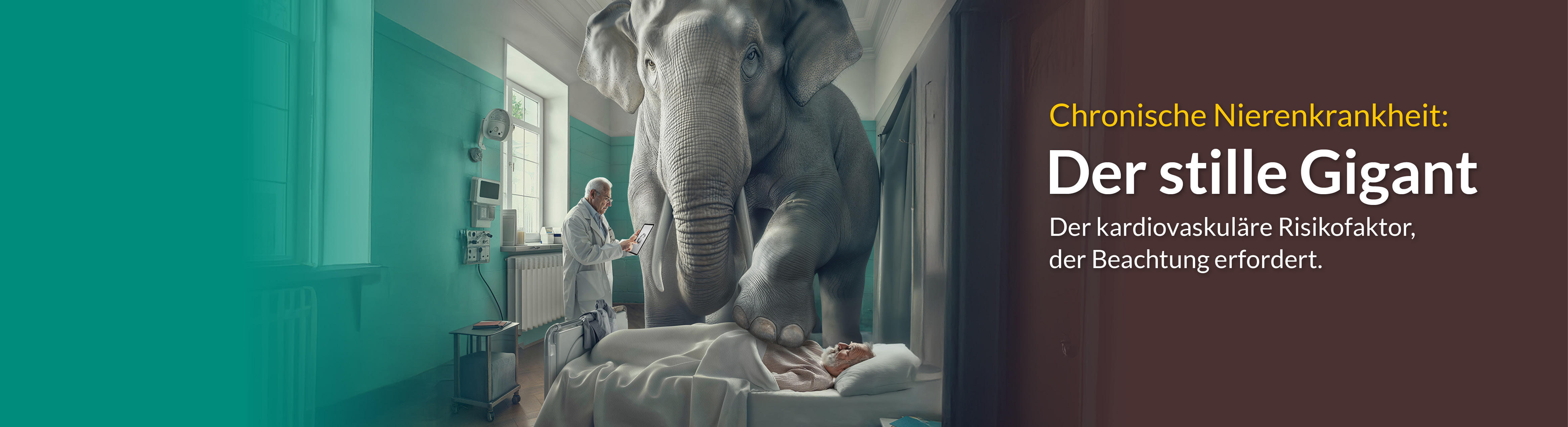 Erfahren Sie, welche Risiken eine verspätete oder fehlende Behandlung der CKD birgt und wie die Erkrankung das Outcome anderer Diagnosen beeinflussen kann. Unser Ziel: der chronischen Nierenkrankheit, dem Elefanten im Raum, die Aufmerksamkeit zu geben, die erforderlich ist. Für eine leitliniengerechte und vorausschauende Versorgung Ihrer Patient:innen.